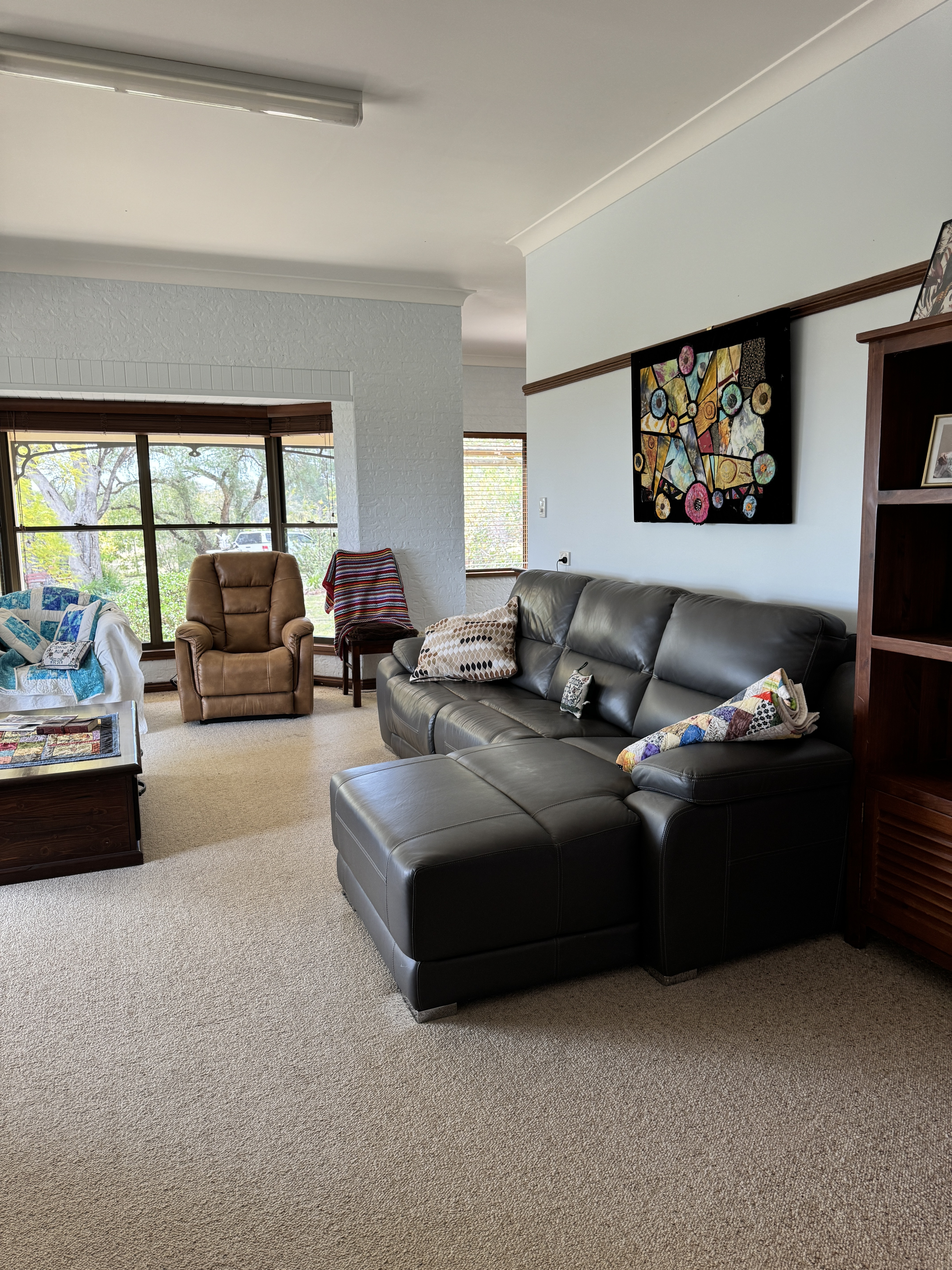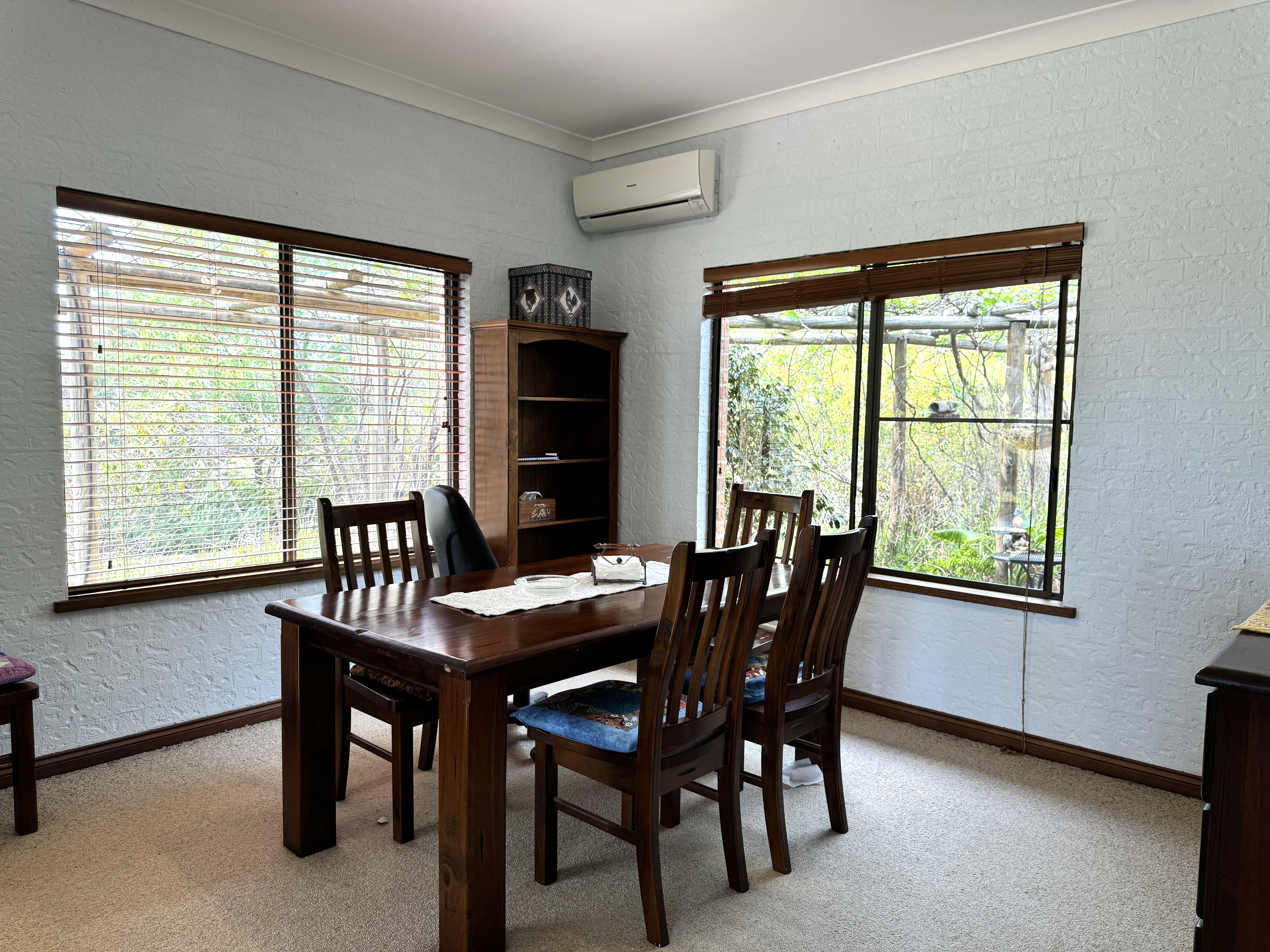 Dining room filters through into a cosy carpeted loungeroom with bay window and 360 degree views.