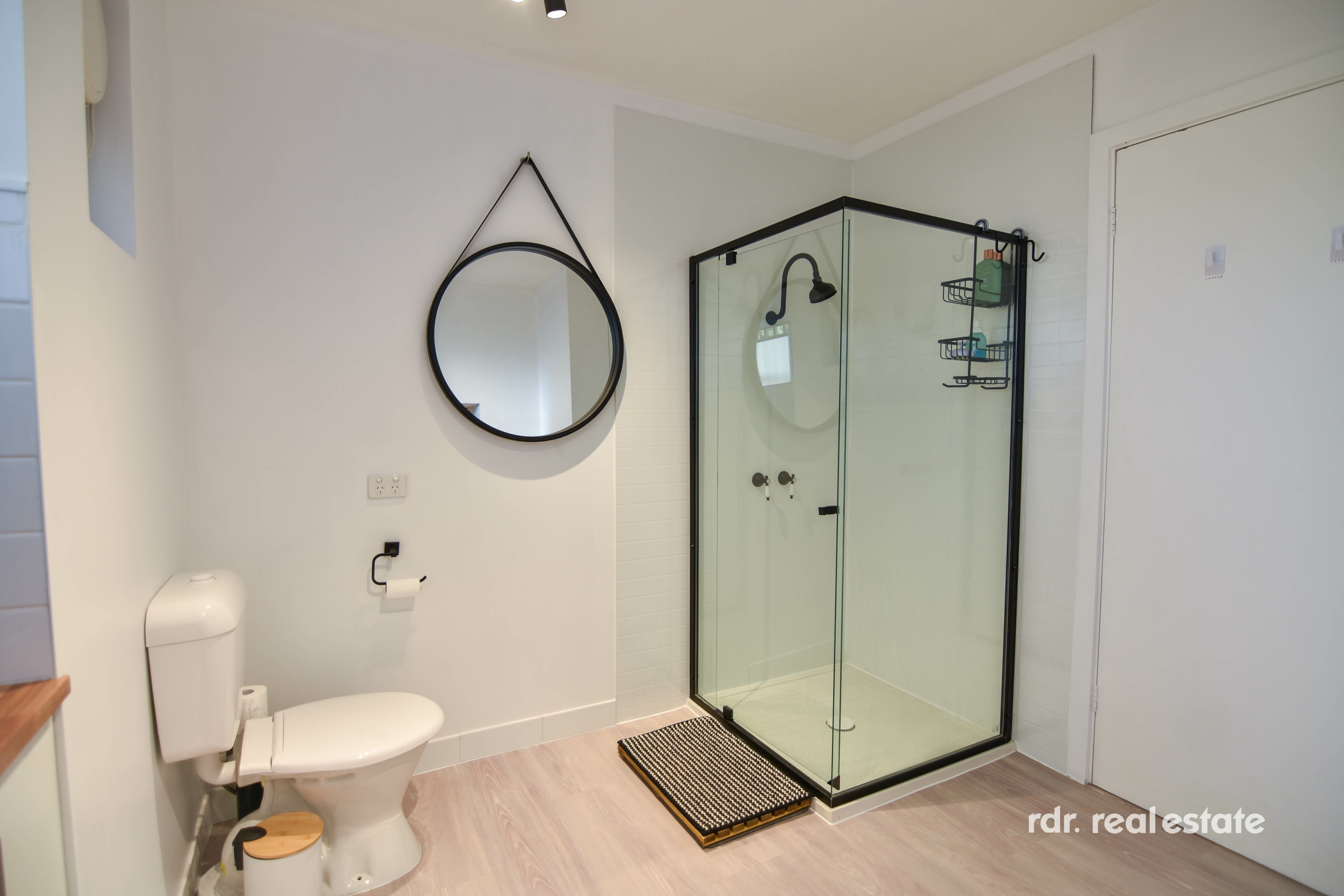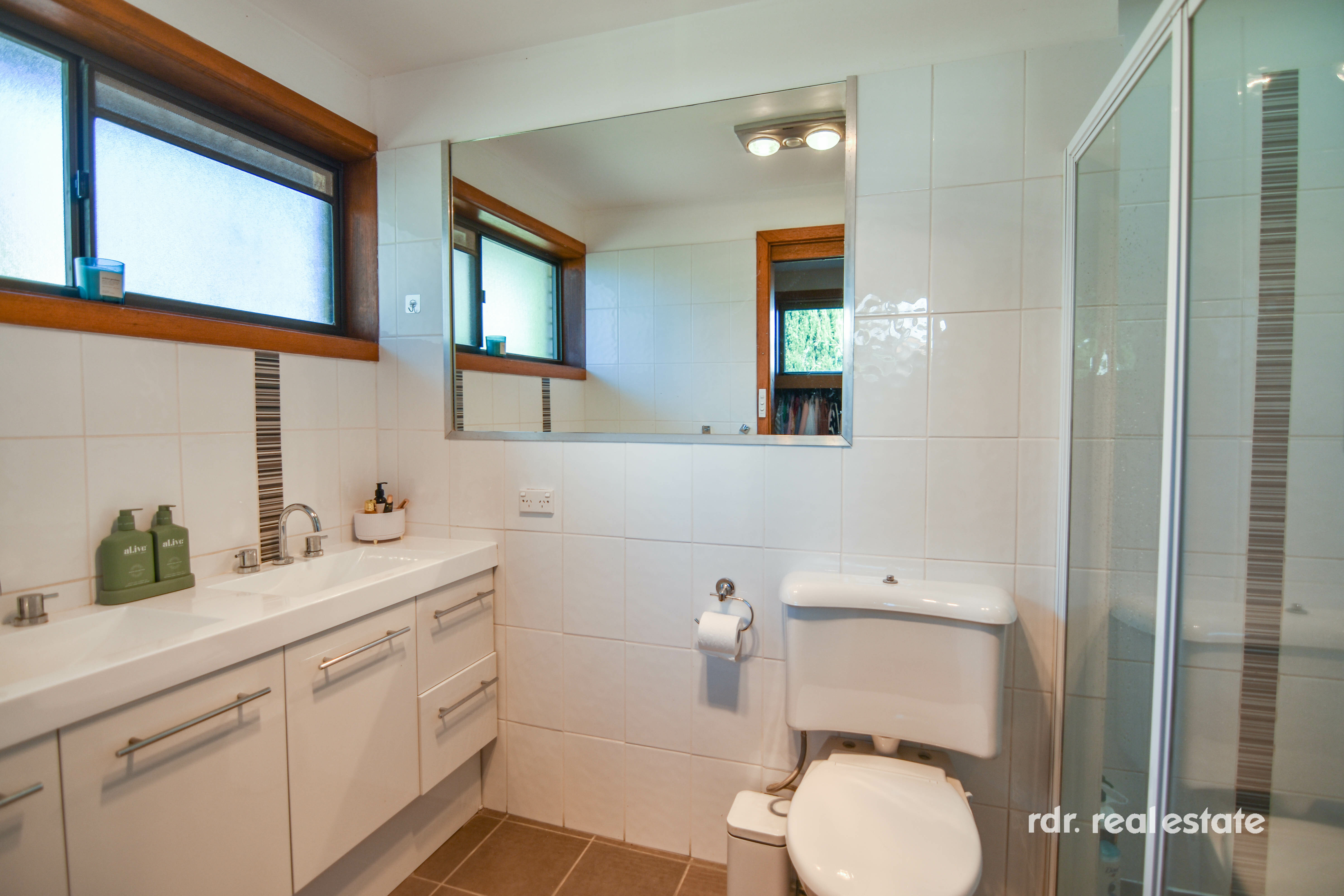 Family bathroom upstairs comprises of a shower, bathtub, vanity and toilet. The downstairs bathroom includes the laundry, shower, toilet, storage cabinets, and stylish finishes.