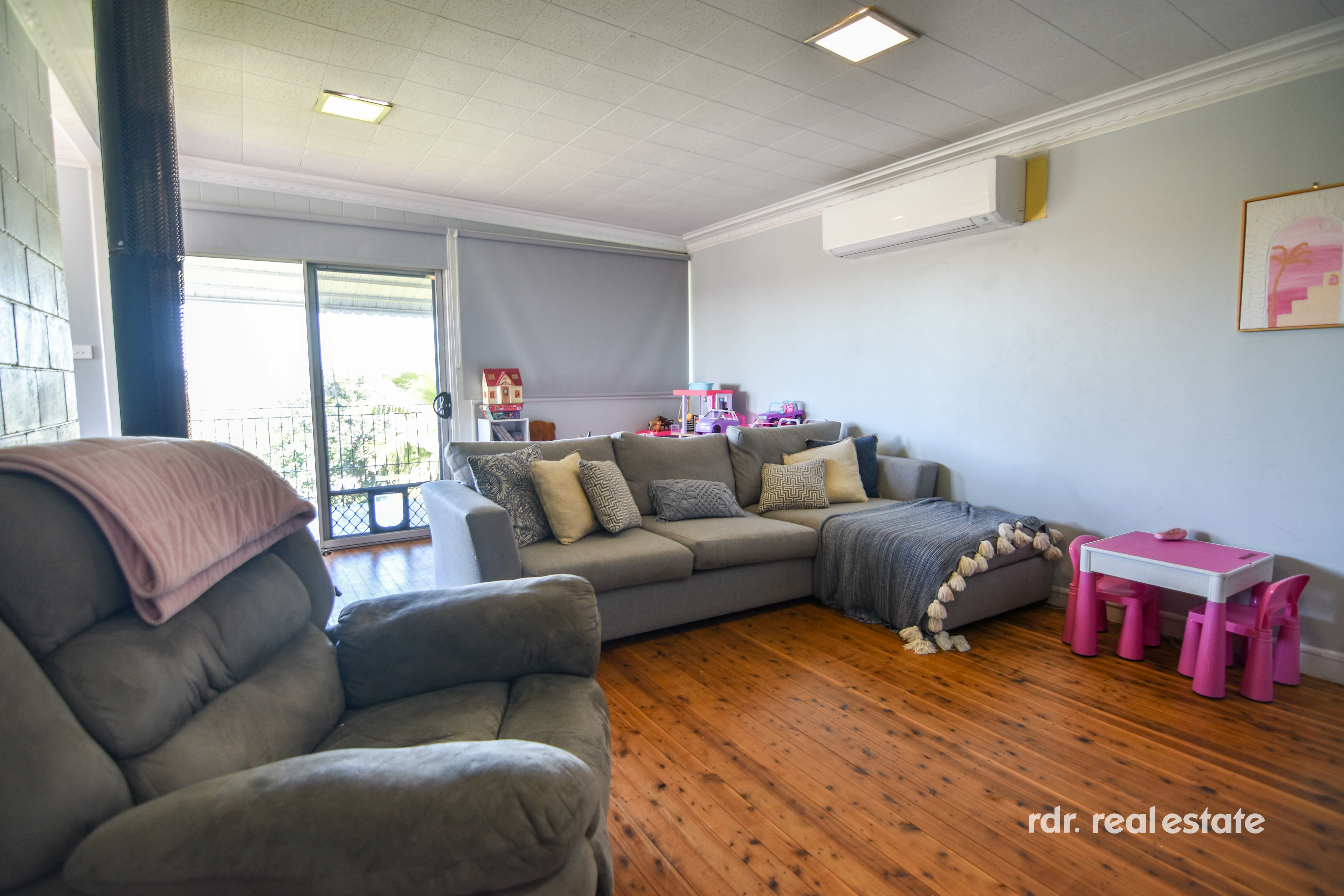 Lounge room offers reverse cycle air conditioner, a wood heater, and plenty of room for the family to gather. As you slide open the glass door, you are met with amazing views over town and a covered balcony.